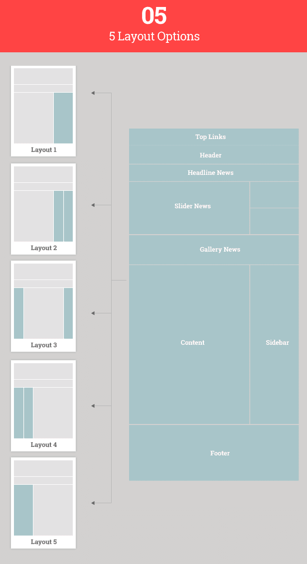 You can choose from 5 different layout options. You can also choose for wide or boxed layout.